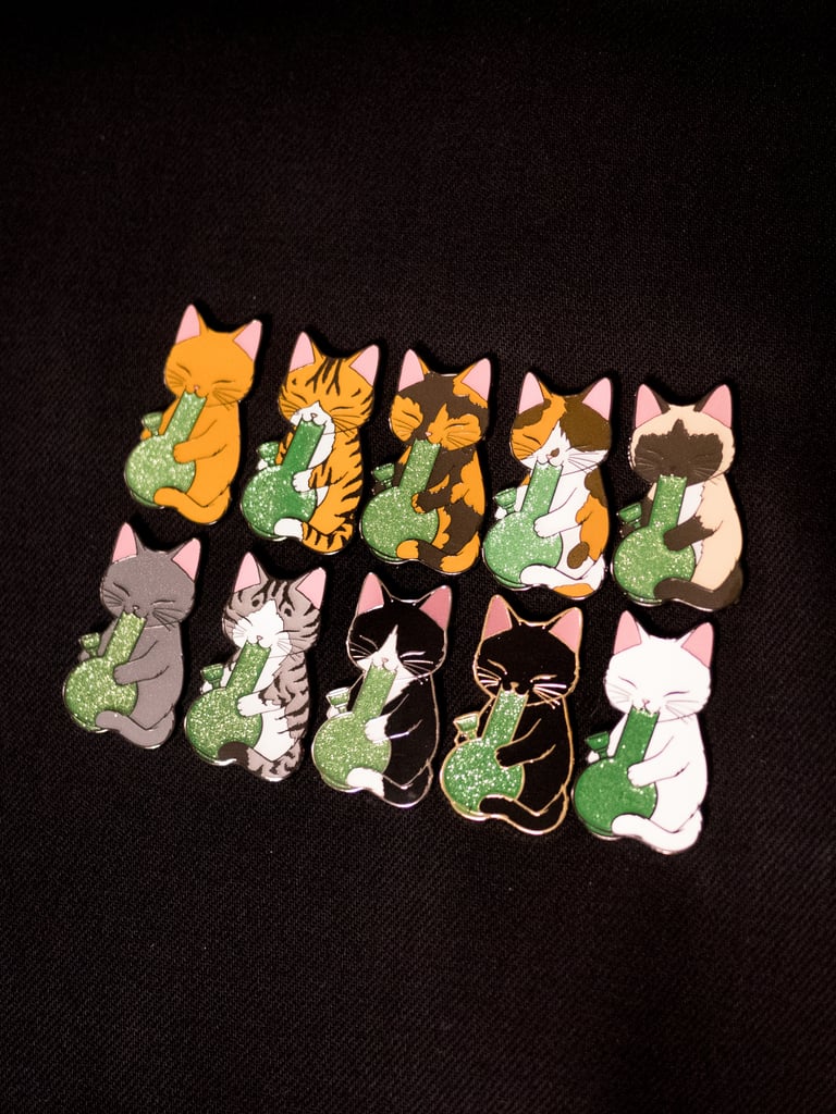 I teamed up with Lillian Joan to bring you this set of 1.75 in. ‘Best Buds’ pins for 4/20! Each colored cat comes with a sparkly green bong and two backing posts to make sure your lil buddy stays safe and secure to whatever you attach it to.