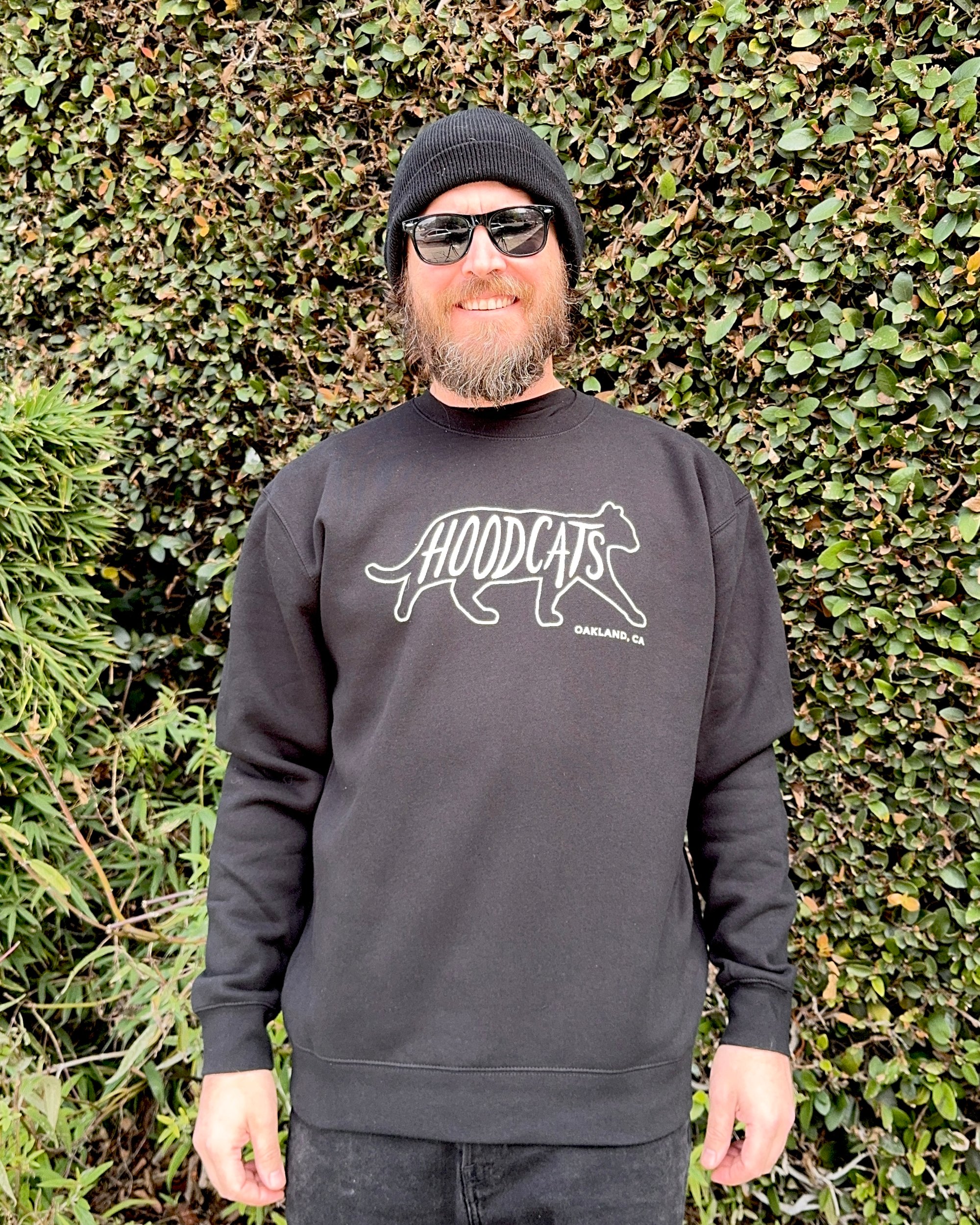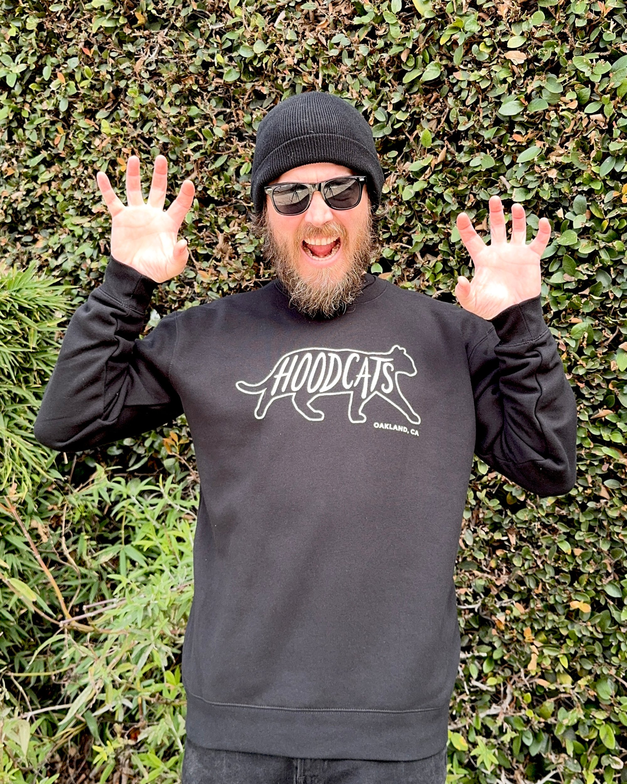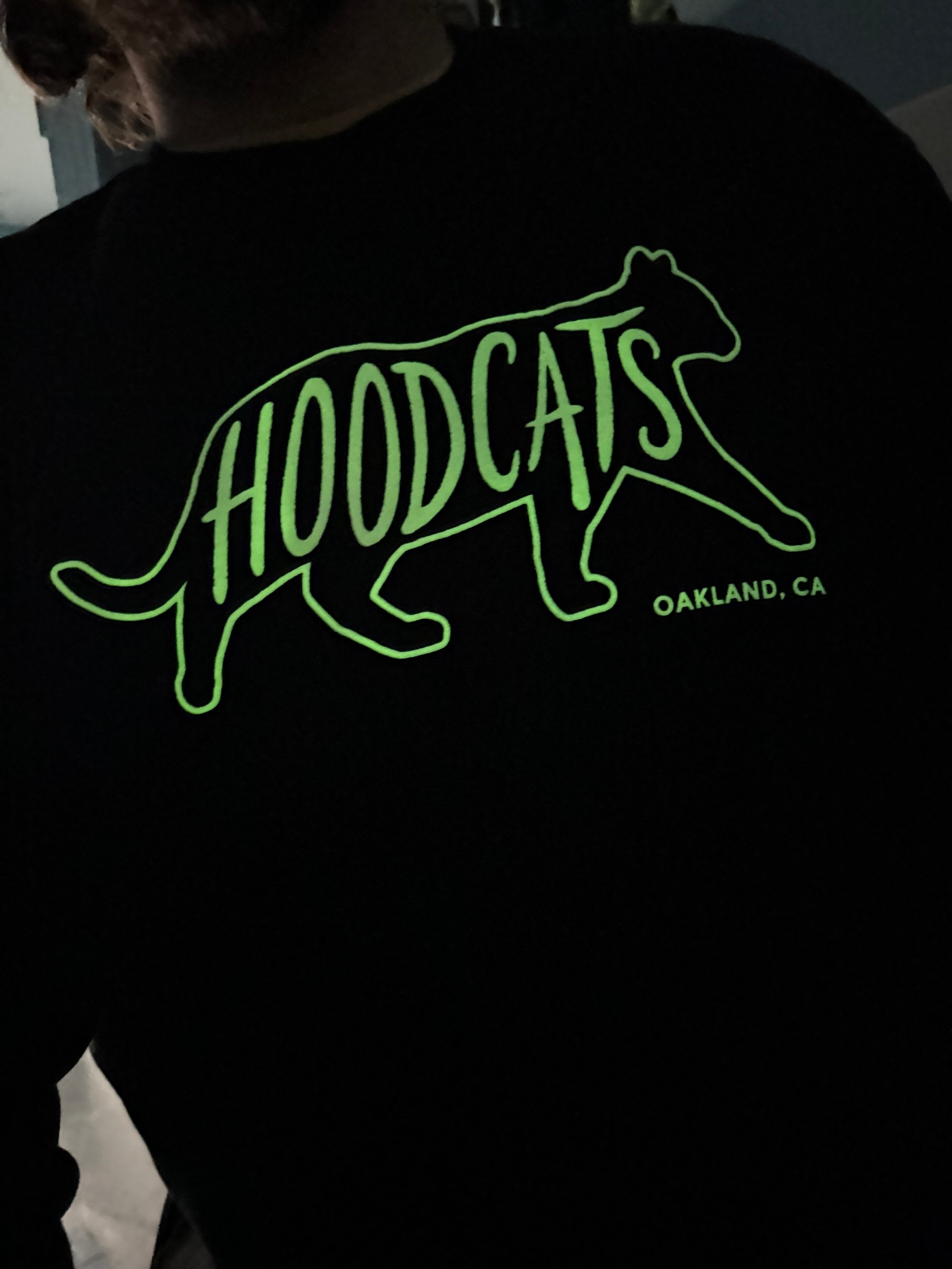New *Glow-in-the-dark* Hoodcats crew neck pullover sweatshirts! Screen printed here in Oakland with a double pass of glow-in-the-dark ink, for extra strong glow!
