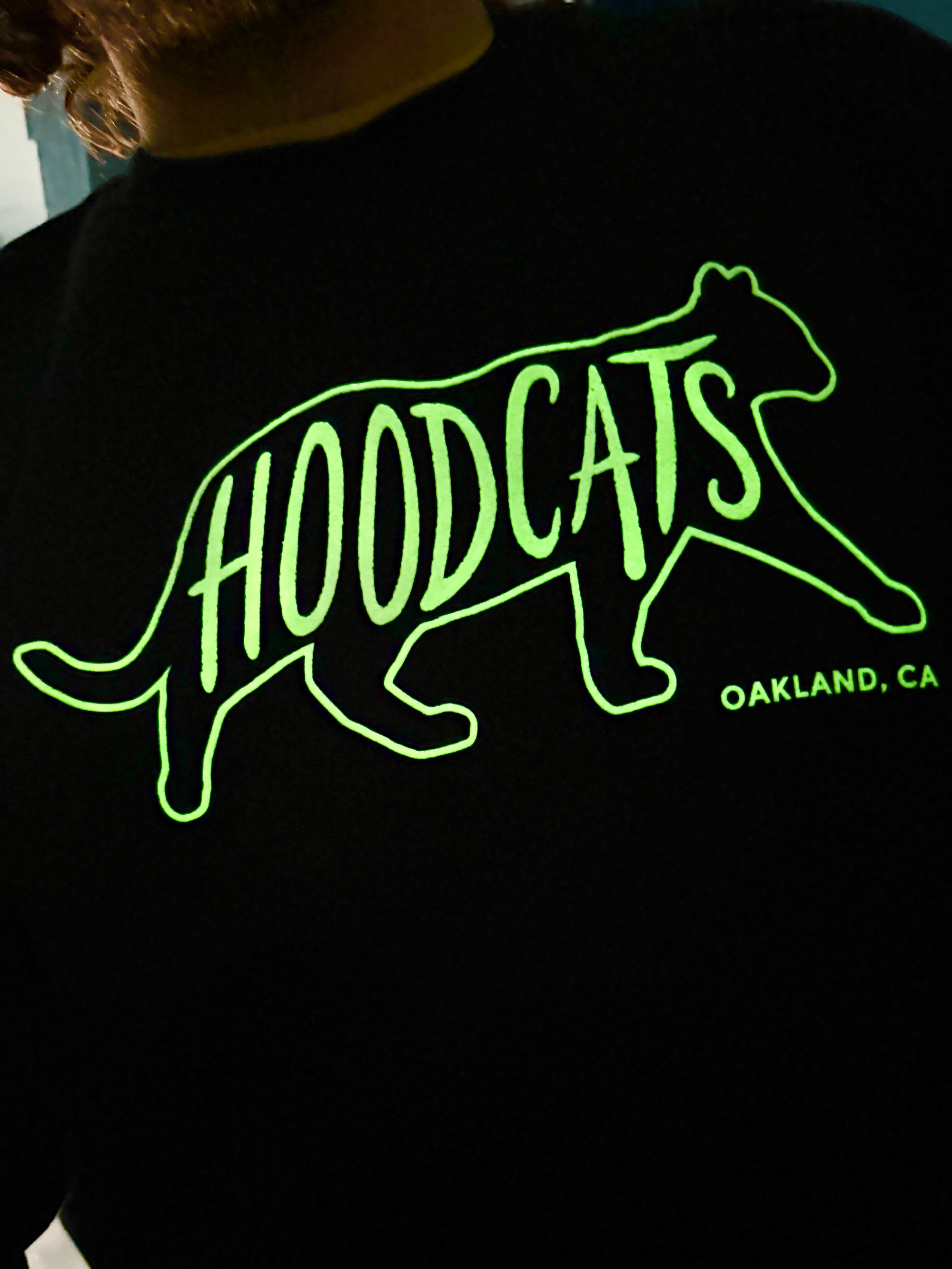 Hoodcats logo in White with Glow In The Dark ink on Black Next Level Shirts shirts.